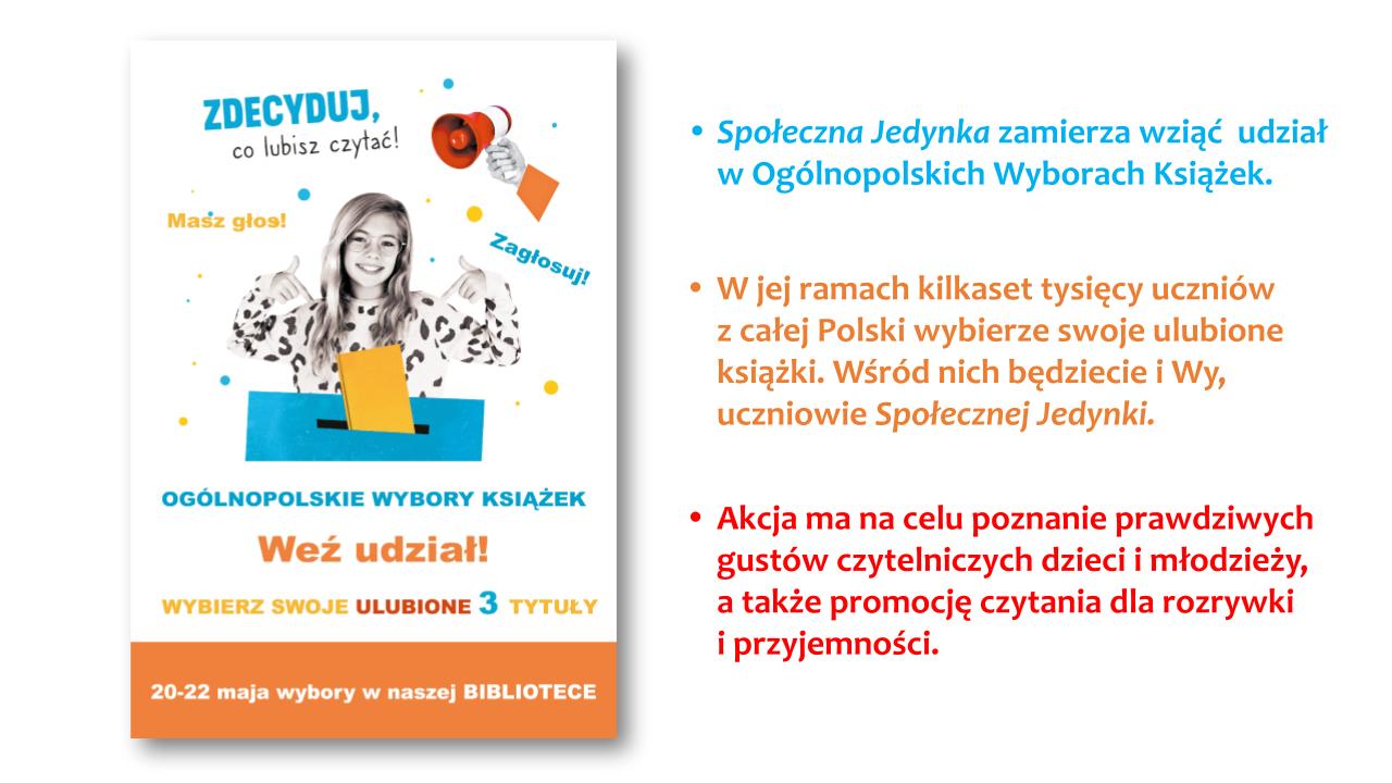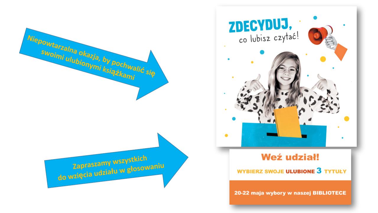 W dniach 20-22 maja nasi uczniowie i uczennice zagłosują na trzy tytuły ulubionych książek. Dzięki akcji poznamy najbardziej popularne książkowe propozycje uczniów i uczennic z całej Polski.