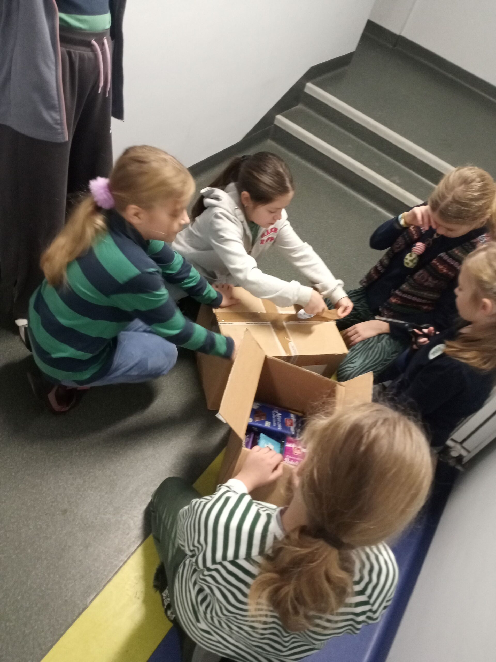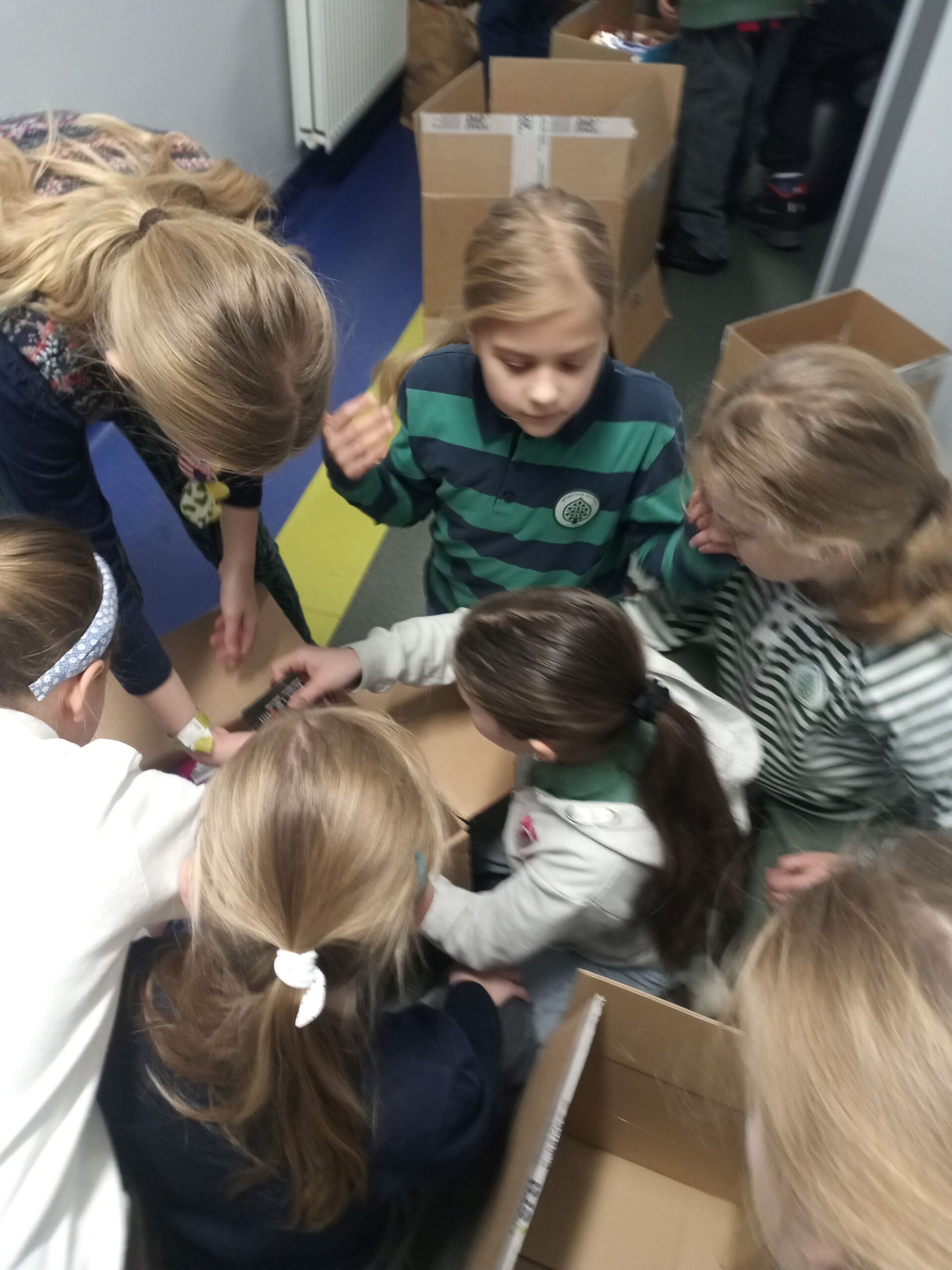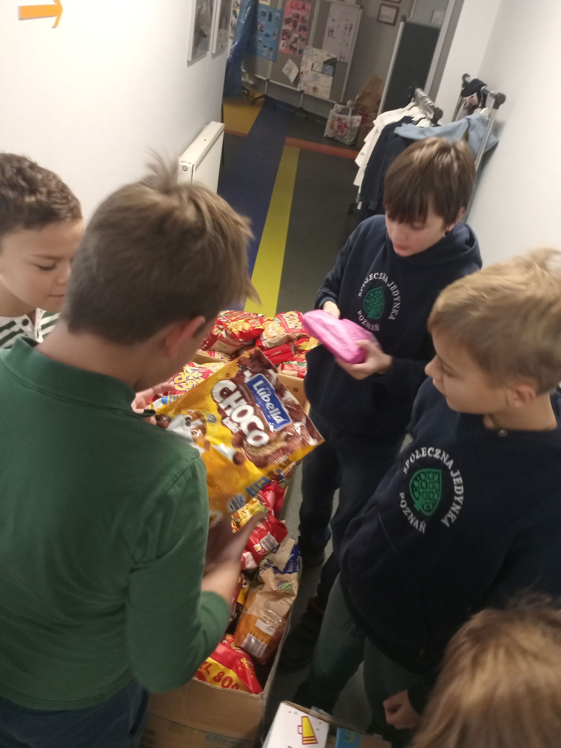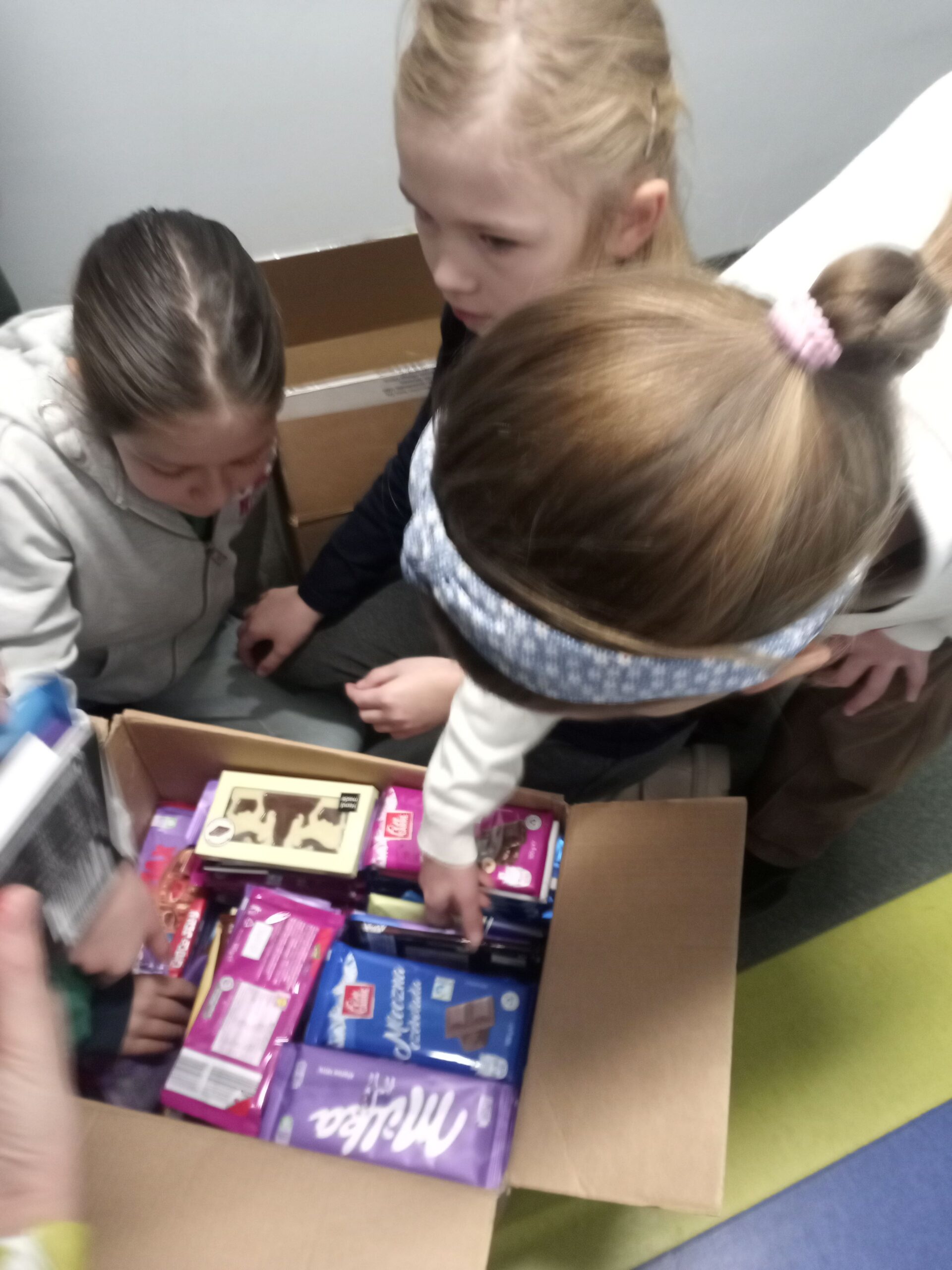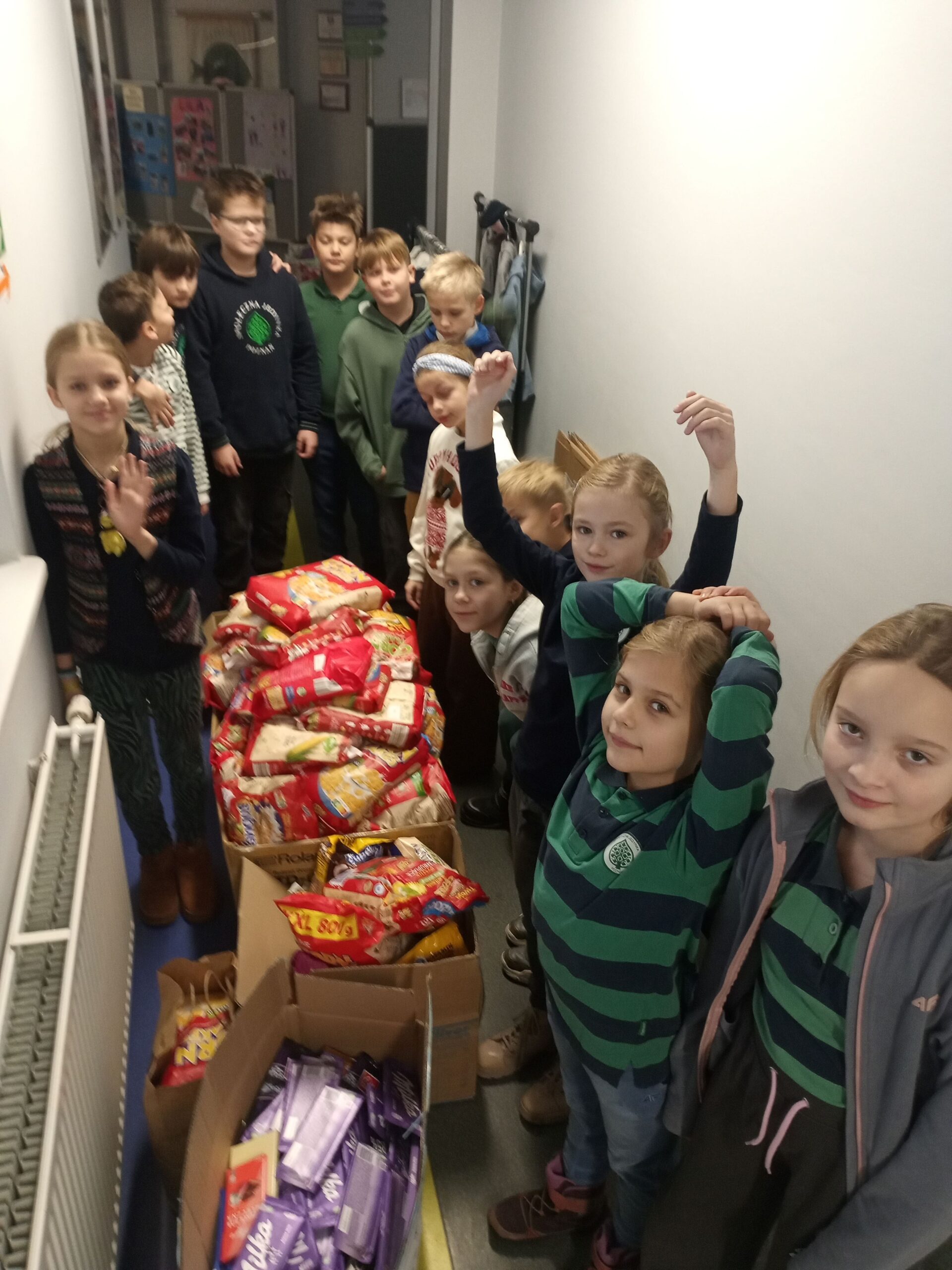 Pomocną dłoń – i to niejedną! – w pakowaniu darów ofiarowała klasa 3b, natomiast wszystkie paczki zostały dostarczone na miejsce przez ucznia klasy 6a, Jana Krzysztofowicza, i jego tatę.